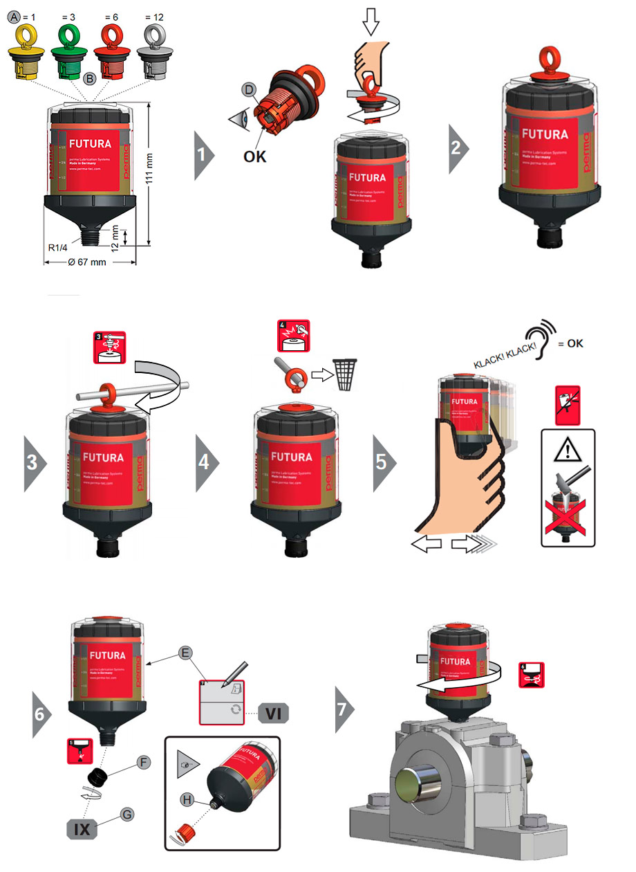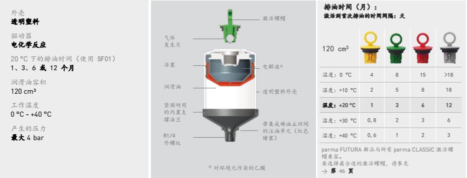 對(duì)于那些對(duì)衛(wèi)生條件要求較高的區(qū)域或可能會(huì)腐蝕金屬注油器或電子系統(tǒng)的惡劣工作環(huán)境,perma FUTURA 是理想的自動(dòng)潤(rùn)滑系統(tǒng)。它基于電化學(xué)反應(yīng)的工作原理極其可靠。其潤(rùn)滑周期取決于按顏色區(qū)分的激活螺帽。