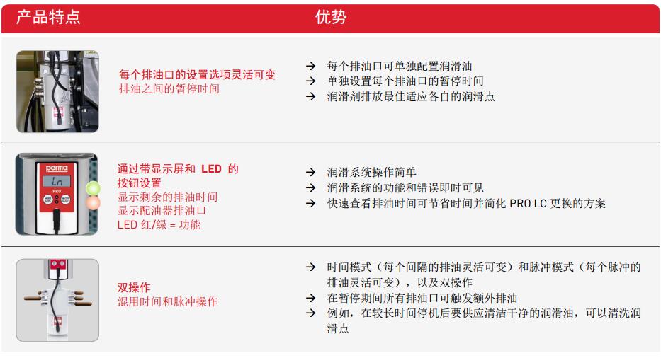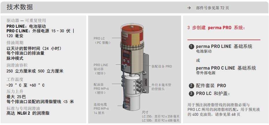 perma PRO LINE 和 perma PRO C LINE 是用于線性導軌的可變多點潤滑系統。排 油可精確適應制造商的規格。六個排油口都可以靈活設置潤滑油的數量和再潤滑間 隔。PRO LC 注滿 250 或 500 立方厘米的潤滑脂。產生的高壓使每個排油口的遠程裝 配使用潤滑脂管線長達 5 米。這增加了工作場所的安全性,同時允許對運行中的系統 進行可靠潤滑。
