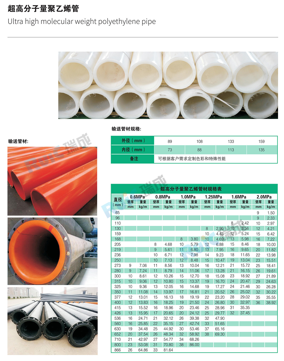 8、糧食輸送;衛生無毒、高速輸送、不堵料、耐磨損、性價比高。超高分子量聚乙烯(UHMW-PE)管材規格及使用工作壓力可根據用戶要求制作。